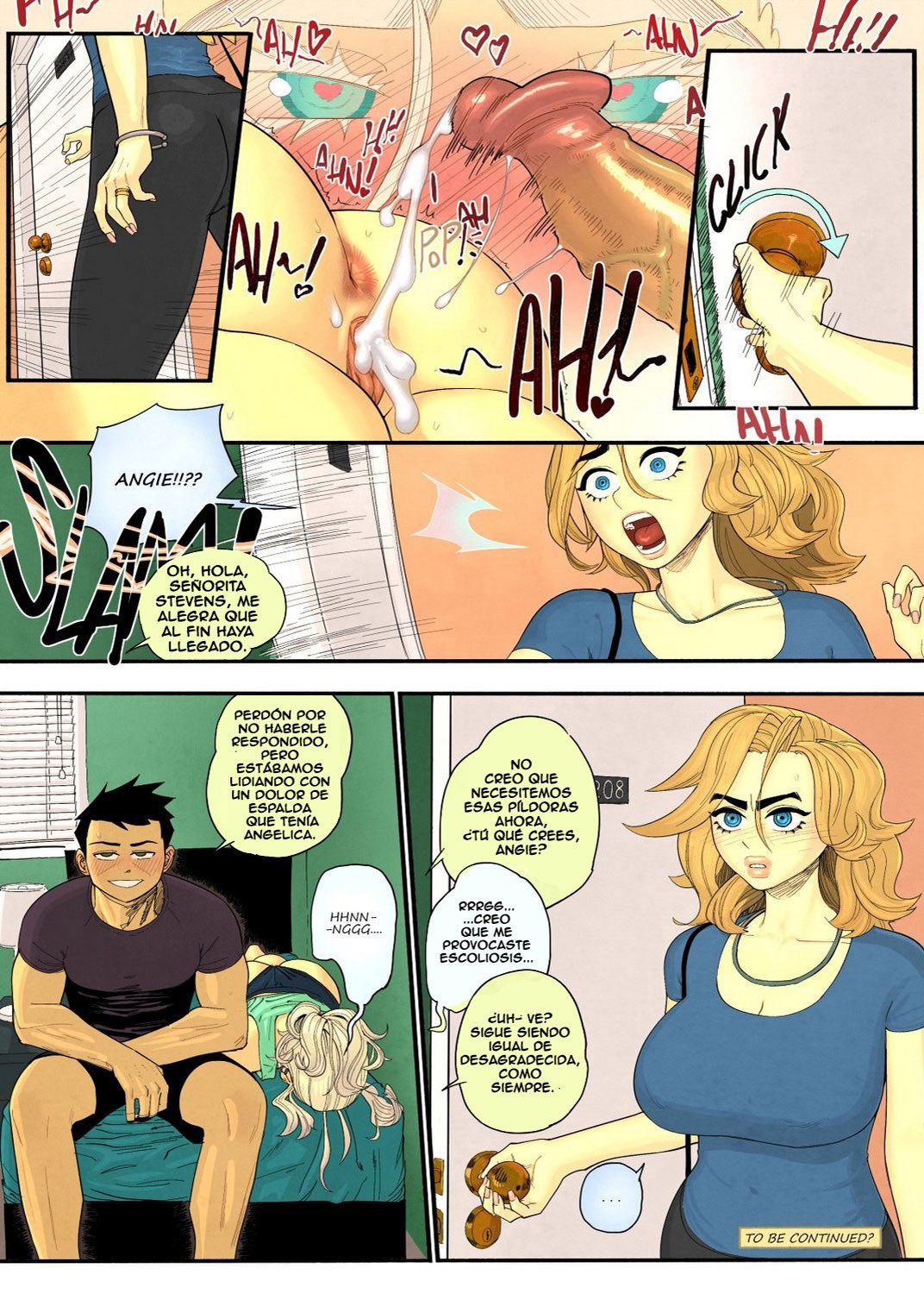 Ni se imagina que su hermanastro ha aumentado la velocidad porque su madre está por llegar a la habitación. Él no para de apresurarse para llegar al orgasmo antes de que ella entre, y justo logra correrse e inmediatamente se viste. En ese instante se abre la puerta y la madre de Angelica entra a la habitación. El chico ya está sentado a la orilla de la cama con una sonrisa inocente.
