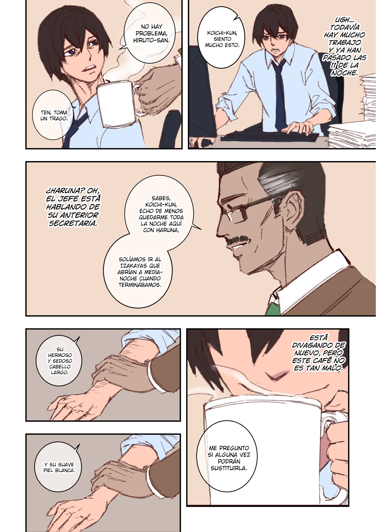 Este bizarro, pero muy caliente cómic de Arisane cuenta la historia de Koichi, un trabajador dedicado que ha tenido que quedarse hasta tarde en la oficina trabajando. En ese momento su jefe Hiruto se acerca hasta su escritorio para ofrecerle una bebida caliente y aprovecha para buscarle algo de conversación. Comienza diciéndole que echa de menos quedarse hasta altas horas con Haruna, su antigua secretaria.