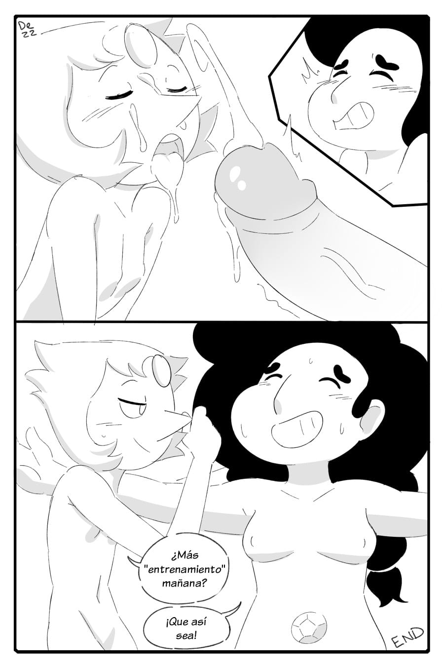 Cuando ya está por correrse, Stevonnie saca su polla para que Perla espere su semen con la lengua afuera. Rápidamente su cara acaba completamente llena de leche y ambas se tiran exhaustas. Definitivamente volverían a entrenar juntas el día siguiente.